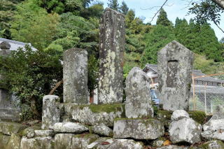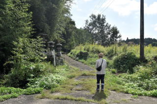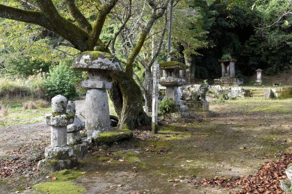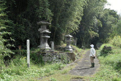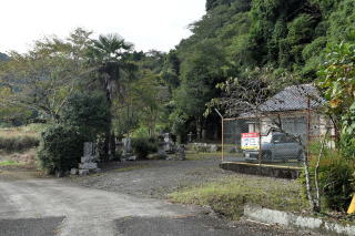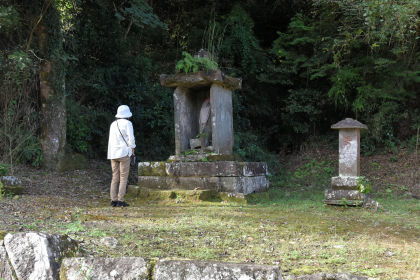 道幅の狭い里道となり、対向車が来ませんように。 約1.6km後、右側に笠良木公民館が見えてきた。「ここだ!」奥に石造物などがあり、目的の「千光寺跡」に到着。