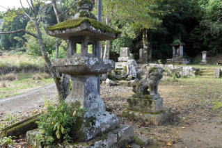 遺跡入口の左側には2基の無縫塔と石幢が並び、奥に向かって燈籠や狛犬など、趣のある雰囲気となっている。石幢は中台から上が少し傾いているが、それほどの傷みは見あたらない。龕部は4面体で六地蔵と十王と思われます。また、入口の右側には庚申塔や大乗妙典塔など石造物が4,5基が並んでいる。