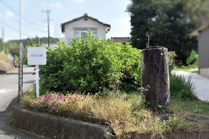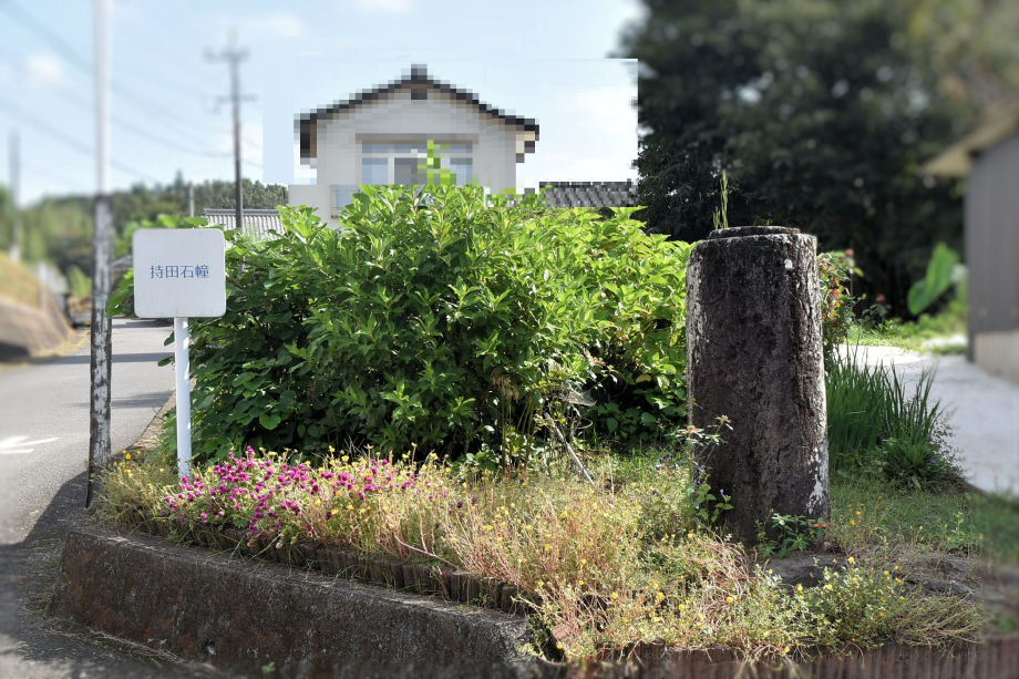 次の目的地「桐木石幢」を目指して国道502号線を行き、「都松地区ふれあいセンター」の手前から一般市道に分岐する。集落の狭い四つ角を通り抜けようとしたその時、「持田石幢」と書いた標識が立っていた。「えっ、これ?」 標識の横に円筒型の石が、ポツンと立っていた。なんと、胴体(幢身)だけの石幢だった。