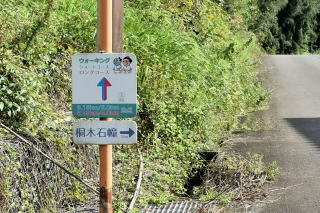 「持田石幢」から市道をさらに進むと、約200m後、左の「都松ふれあいセンター」から来た細道と合わさり、直後の道路わきに目指す「桐木石幢」の案内板が置かれていた。