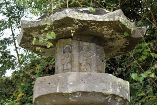 石幢は、上から下まですべて八角形で造られている。龕部はかなり高い位置になるが、少し離れてみると八角形の角々には銘文があり、各面には一体ずつの地蔵菩薩と三王などが半肉彫されている。