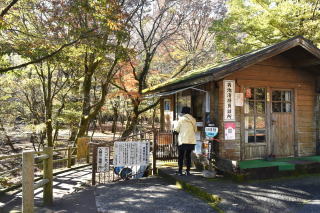 「紅葉はどうかなぁ」駐車場のドウダンツツジに見送られながら、男池湧水群入口に向かう。 入口の小屋は「男池清掃員詰所」となっており、清掃協力金(ひとり100円)を払って入園。