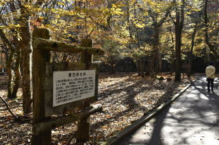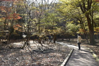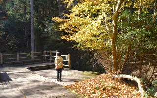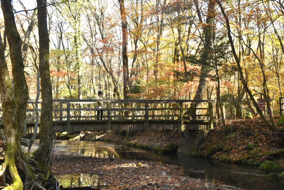 園内を流れる清流があり、趣のある木橋を渡る。風もない穏やかな秋日和だが、高い梢から、はらはらと音もなく落ち葉が舞い降りている。ブナの木だろう。