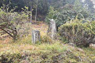 「熊野摩崖仏」への案内板を見て約450m後、右側に旧道のある変則Y字路に到着。 と、その横に「庚申塔」が置かれていた。しかし、その説明板等はなかった。