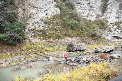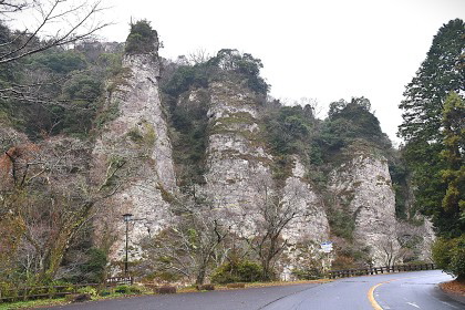 県道655線をさらに北上し、田染「真木大堂」を過ぎた直後の十字路を右折して県道34号線(豊後高田安岐線)に進む。 桂川沿いの景色となりながら約1km後「あっ、あれだ!」高い岩峰群が現れ絶景の駐車地に到着。
