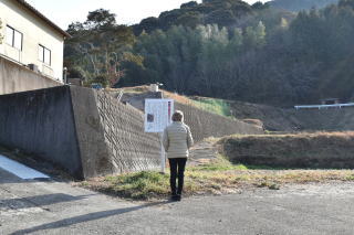 先の「長曾我部信親終焉の処」から約900m後、「銅尻」交差点には、目印となる「鶴賀城・成大寺」の案内標識が置かれており鋭角左上に分岐する。狭い里道を約150m後、右側、民家の角地に「千人塚」の説明板が立っていた。