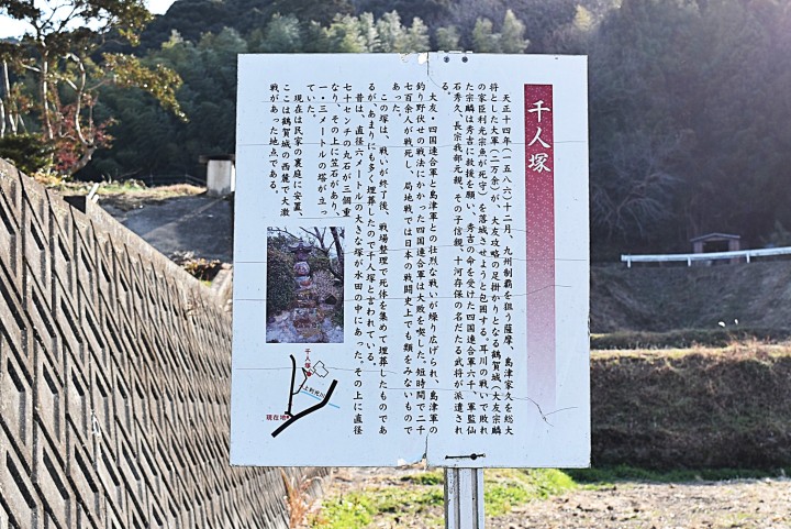 説明板の概要は“千人塚:天正14年(1586)12月、九州制覇を狙う薩摩、島津家久を総大将とした大軍(2万余)が、大友攻略足掛かりとなる鶴賀城(大友宗麟の家臣利光宗魚が死守)を落城させようと包囲した。大友宗麟は豊臣秀吉に救援を願い、秀吉の命を受けた四国連合軍6千が派遣される。 大友・四国連合軍と島津軍との壮烈な戦が繰り広げられ、四国連合軍は大敗を喫し、2700余人が戦死した。