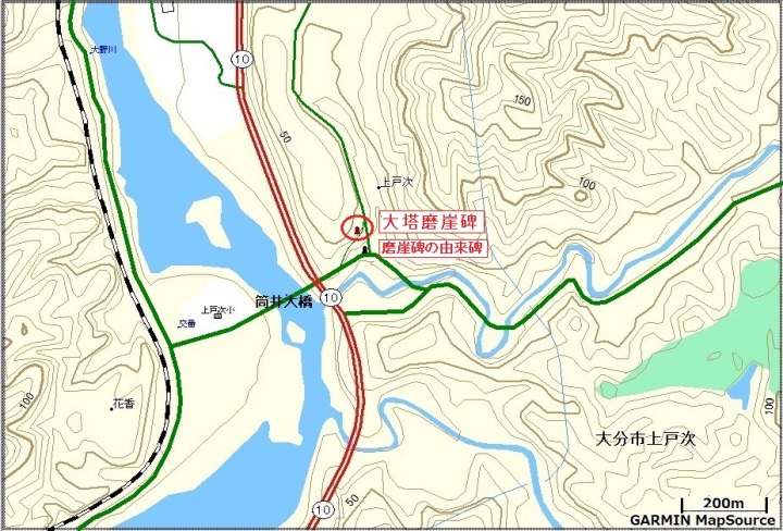 十字路にある石碑「磨崖碑」には、背面に由来が刻まれており“天文16年(1547)大塔村南ノ坊に住んでいた天台比丘労寿が亡き母妙本祥尼大練忌供養のためと月香梅心童男の繁栄のため南無阿弥陀佛の六字を彫刻し造立したものである:昭和55年:大分市大南地区文化財同好会”などとなっていた。「ん?」天文16年(1547)とは、「戸次川の大戦(天正14年(1586))より40年ほど前のこと。「戸次川の合戦」との関係はなさそうだ。