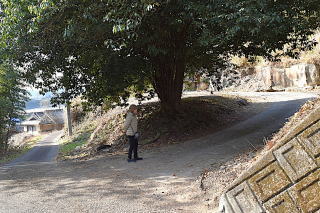 長い説明文だが、添えられた略図や写真を参考に、千人塚まで辿ってみることにした。 現在地から右上に延びる細道を行くと、50mほどで右下に折れる枝道があり、民家に向かっていく。その先に次の案内標柱があり民家の裏道に進む。「あっ、あれだ!」 写真と同じ姿をした千人塚に到着。