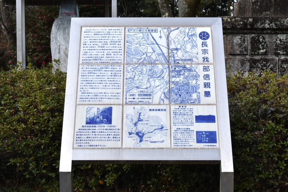 その中ほどに陶器製の説明盤があり『長宗我部信親墓』となっているが、“1586年(天正14年)11月”から始まる、長い文章は 長曾我部信親の戦死、さらに荼毘に付されたことまで記している。関連の絵図なども添えられ、「戸次川原合戦」の歴史を垣間見ることができる。