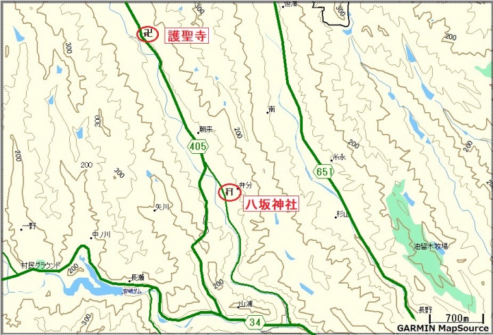 先の国道分岐から約9.7km後、「梅園の里」や「護聖寺」などの案内標識に続き「朝来入口」の案内標識が置かれていた。右折し一般市道に進む。 約2.2km後、ト字分岐があり直角右に分岐する。「あっ、あれだ!」正面に一対の燈籠があり、「八坂神社」の正面に到着。