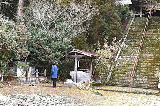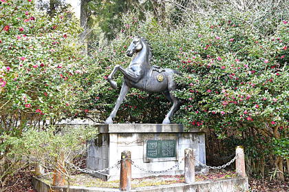 明るい陽射しに期待したものの、気温は4℃。日陰には昨日までの雪が残っており、防寒対策は万全に。 少しの石段を登ると広場となっており、「あっ、お馬さん」サザンカの茂みには、立派な「ご神馬」が祀られていた。