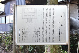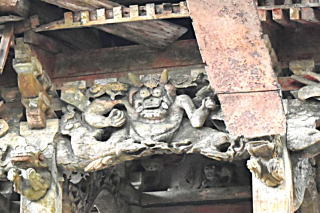 かなり傷んでいるようだが、まずは説明板に目を通そう。“町指定有形文化財:五霊社:元禄10年(1697):弁分八坂社の五霊社は、大正8年(1919)に八坂社新築に伴い、旧本殿を移築した。小屋裏内に修理棟札が残されており、元禄10年(1699)の建立となっている。三門社流造、向拝一間、鉄板葺:向拝中央にある鬼は他に類のない彫刻。当初は弁柄を基調にした彩色を施していた。建物保護のため昭和60年覆屋設置。”などとなっている。