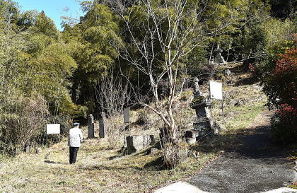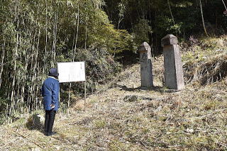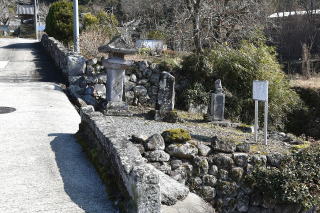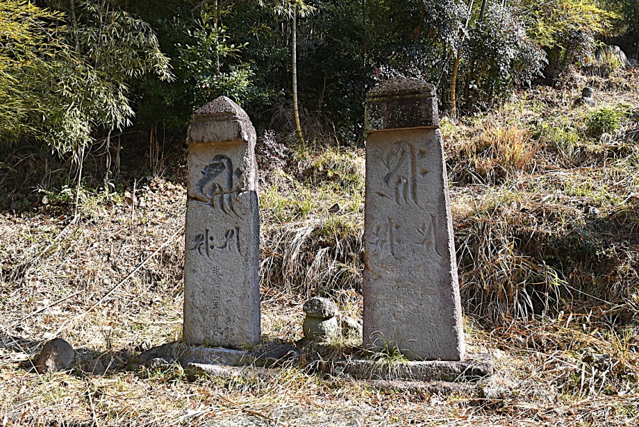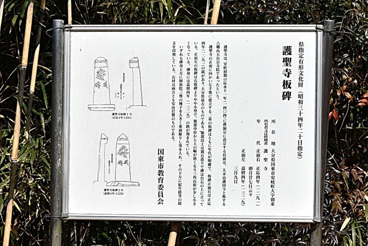一石五輪塔のすぐ奥に、「これだ!」という感じで、背の高い板碑が2基立っていた。説明板によると“県指定有形文化財:護聖寺板碑:右(護聖寺板碑1号)・正応4年(1292),左(護聖寺板碑2号)・嘉歴4年(1329):二基の板碑は、ともに年代が明確で、右は正応4年(1292)の銘があり、大分県最古のものである。左の板碑は右板碑よりやや小型で、碑身には嘉歴4年(1329)の銘が刻まれている。:国東市教育委員会”などとなっている。