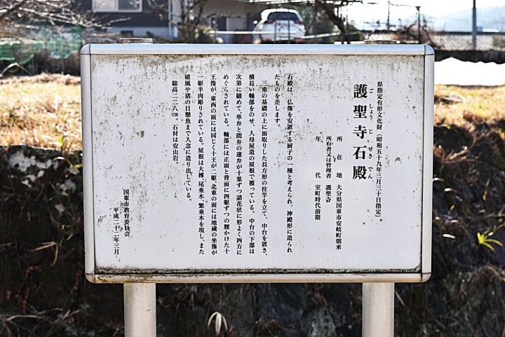 説明文は“県指定有形文化財:護聖寺石殿:室町時代前期:石殿は、仏像を安置する厨子の一種と考えられ、神殿形に造られたものを差す。基礎の上に長方形の柱竿を立て、中台を置き、横長い軸部をのせ、入母屋の屋根で覆っている。軸部には正面と背面に4躯ずつの十王像、東西の面には十王が2躯、北東の面には地蔵が1躯半肉彫りされている。入母屋の屋根。総高228cm。:国東市教育委員会”などとなっていた。