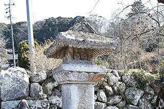 県道から歩き始めると、早速という感じで文化財の「石殿」が見えてきた。期待しながら小さな太鼓橋(文化年間の碑文)を渡る。 右側に、はみ出したような小広場があり、主役の石殿をはじめお供のような石造物も置かれている。