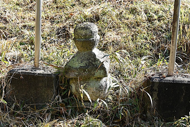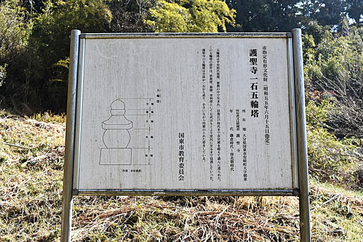 奥まったところに、背の高い板碑が2基見えているが、まずは、手前の「一石五輪塔」。説明板によると“市指定有形文化財:護聖寺一石五輪塔:鎌倉時代~南北朝時代:五輪塔は平安時代後期、密教の中で生まれ、以後江戸時代まで各宗派を超えて造られた。護聖寺の五輪塔は全体が一石から成り、小さいながら均整のとれた形をしている。:国東市教育委員会”などとなっている。