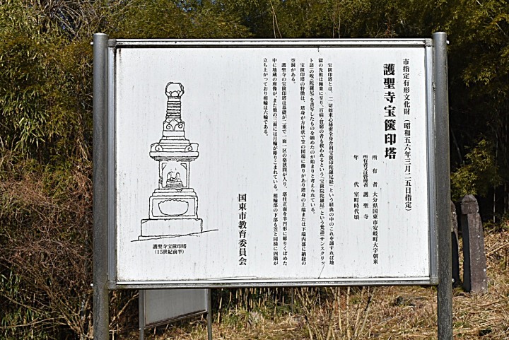 護聖寺の最後は「護聖寺宝篋印塔」。 右端に所在し、植え込みなどの関係もあり、傾いて見えるが大丈夫。説明板によると“市指定有形文化財:護聖寺宝篋印塔:室町時代頃:護聖寺の宝篋印塔は基礎が二重で格狭間が入り、塔柱正面を半円形に彫りくぼめた中に地蔵の坐像が、他の三面には月輪が彫りこまれている。:国東市教育委員会”などとなっている。