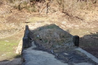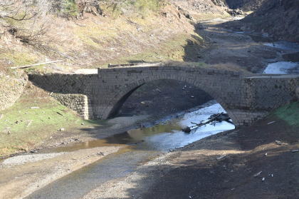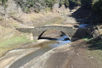 宇目町の「北川ダム」では渇水期になると水位が下がり、湖底に沈んでいた橋が再び姿を現してくるという。 ここ「田代橋」でも、上流側に美しい石橋が姿を現していた。