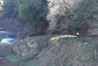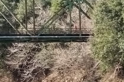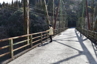 「見えるかな?~」期待しながらトラス構造の「田代橋」を渡り始める。ドキドキしながら歩いていくと、「あっ、あれだ」左下に見え、石橋の全容が姿を現していた。ダム湖というより、小川程度の小さな流れだった。残念ながら日陰となっており、石橋の姿は弱い。