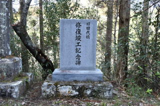 背面に碑文が刻まれており“旧田代橋は明治41年に田代区の念願が叶い竣工を見る。昭和37年の北川ダムの完成により、湖底に沈む。長年の水の浸食により、上流側が朽ちるに至った。(社)大分県建設協会宇目分会の7社が相談、無報酬で修復工事を決定し、3月起工、渇水期の期間限定の中、工事を完成させた。ここにその記念を残します。平成13年8月吉日。”などとなっていた。