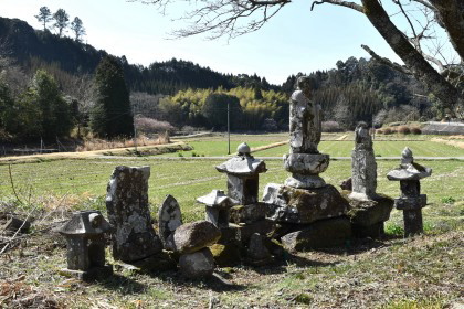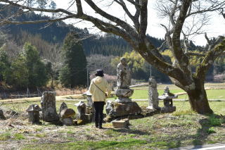 「河内石憧」へ向かう三差路の直前、右側に石仏や石塔群が現れてきた。 近隣の空き地に停め、情報を調べてみると「延命地蔵尊」と云うことが判った。お参りしておこう。