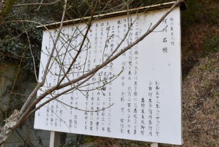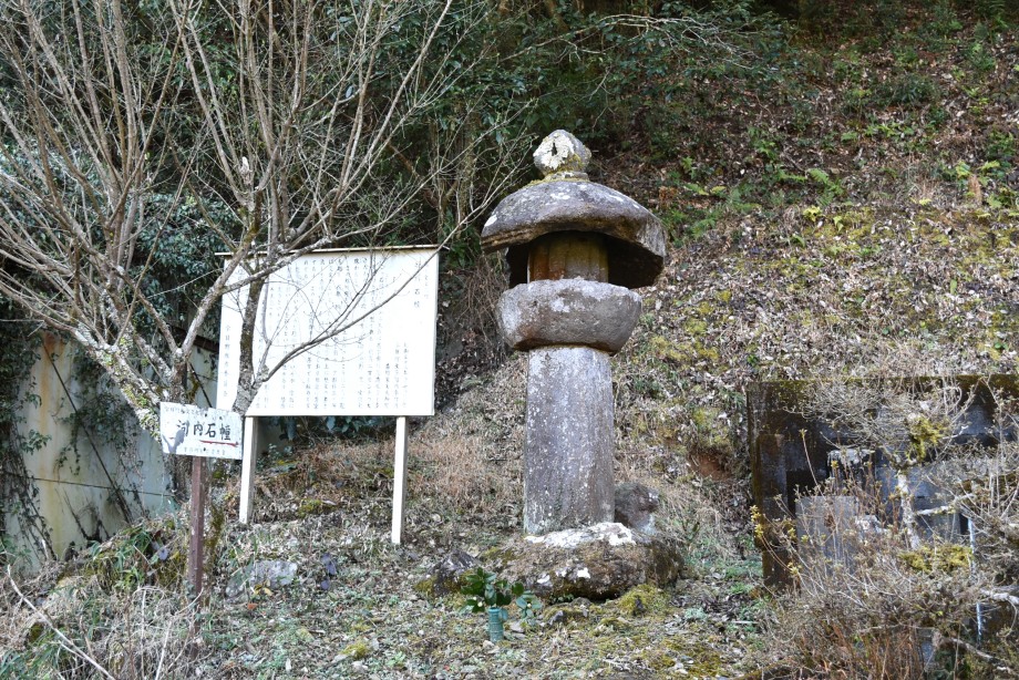 説明板があり、長い文章だが概略は“町指定文化財:河内石憧:この石憧は形体から見れば県南地方で多く見かける角丸混淆型である。総高200センチの大きなもので、基礎、憧身、中台、龕部、笠、火焔宝珠からなっている。 この塔の特色は、龕部上部枠のところに2匹の龍を廻し、頭部、胴、爪、尾部を刻み、下部枠三ヶ所は交差している。また、正面梵字の上に梵文の書き出しを意味する(イ)字が彫られており非常に貴重である。このような龕部彫刻は県下でも極めてまれである。:宇目町教育委員会”などとなっている。