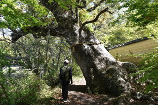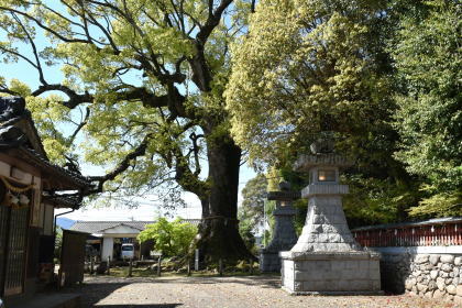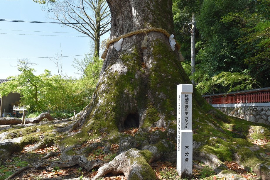 大楠の根元にある標柱は“特別保護樹木(クスノキ):大分県”となっており、県の一覧表では“胸高周囲:1.34m,樹高:25m,推定樹齢:1000年”などとなっており、その大きさに圧倒される。