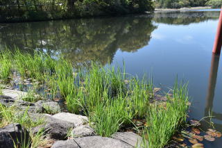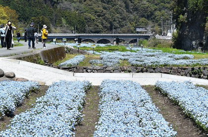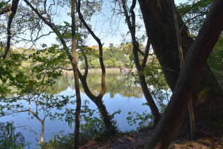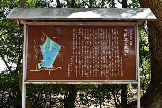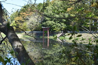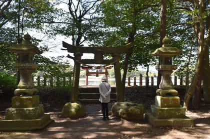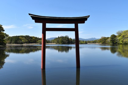 駐車場の正面に葉桜に覆われた鳥居があり、左の袖下に“日本風景街道,豊の国歴史ロマン街道”などと記された標柱が立っていた。納得しながら鳥居をくぐると、正面には赤い屋根の「呉橋」があり、左側には大きな楠木が見える。順路は?