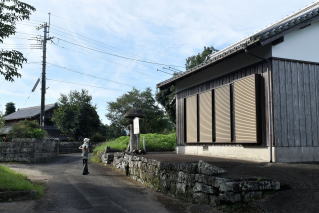 大分市戸次から県道25号線(臼杵上戸次線)を行き、吉野地区を経てさらに南下していくと、鍛冶郵便局などがあり「中臼杵地区」に入っていく。「中臼杵バス停」を過ぎて約50m後、鋭角左に曲がる市道があり、狭い坂道を上っていく。約550m後の三差路を右折すると「あ、あれだ!」お堂と石幢があり「半三石幢」に到着。