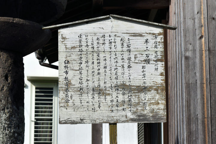 説明板をみると“この石幢は凝灰岩からできており、六地蔵塔です。総高が2.62mで、笠は深く、浮彫りされている六体の地蔵像と二体の仁王像。珍しいのは、仁王像の一体が横向きに彫り出されている。形態から室町時代中期ごろの作と思われる。「善住寺」と呼ばれる寺があった場所であり、他にも宝篋印塔や庚申塔などの石塔が残っている。”などとなっている。