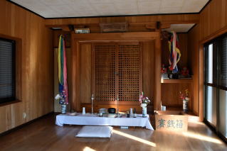 お堂の前には一対の燈籠があり、「安永四年」と刻まれていました。 江戸時代中期の1775年となり、説明文の“「善住寺」と呼ばれる寺があった場所” ではないだろうか。 想像はそれくらいにして、先ずはお参りしておこう。お堂の中には仏間が祀られており、格子戸の中は見えませんでしたが、ろうそくや線香立て、お酒やお花なども供えられていました。