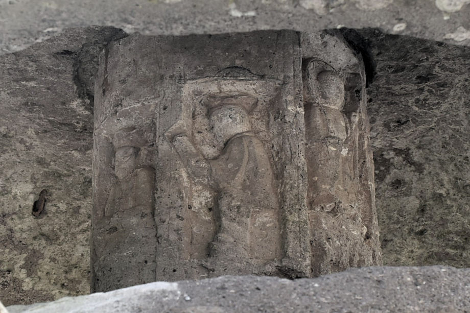 説明板に“仁王像の一体が横向きに彫り出されている。”となっており、改めて笠の中を拝むと、六地蔵のほかに十王の閻魔様や「横向きの仁王像」などが彫り出されていました。
