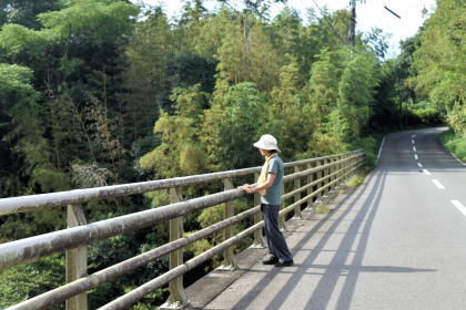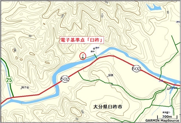 県道に戻り、さらに下って行くと国道502号線の障子岩交差点となり左折する。 臼杵石仏など向かう国道を約700m後、右に「掻懐キリシタン墓」の道を分けると目的地は近い。左側に臼杵川が見えるようになり、その対岸に「あれだ!」 目指す「電子基準点」のポールも現れた。