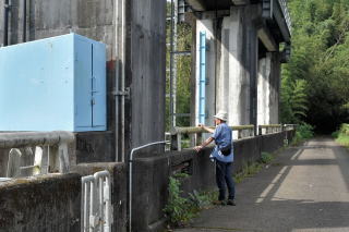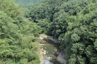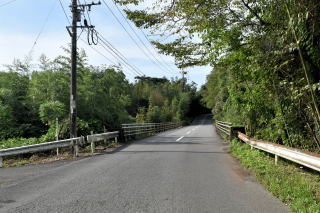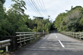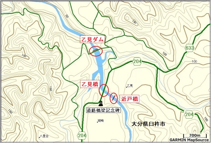 約4.2km後、左から県道204号線(津久見野津線)と合わさり、さらに約600m後、ゆるやかな下り坂の先に「乙見橋」が見えてきた。目的の石橋「近戸橋」はこの橋から望むらしい。 臼杵川(乙見ダム湖)に架かる「乙見橋」に到着。