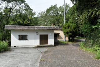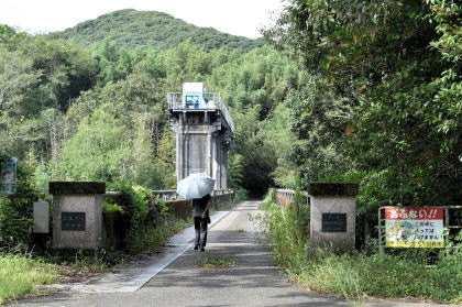 県道を少し戻ると、上り坂の三差路に「ダム入口」のバス停があり、左折して狭い市道に進む。対向車が来ませんように。 カーブの多い下り坂だが約400m後、ダムの管理事務所があり駐車スペースに到着。