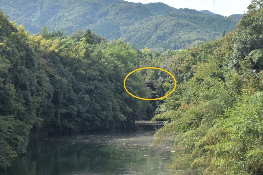期待しながら歩きはじめ、中ほどまで歩を進めると「あっ、あれだ!」左側に、「近戸橋」が現れてきた。運よくダム湖に浮いているが、雑草やクズに覆われ、いかにも「まぼろし」の姿となっている。 「おんせん県おおいた」のHPには“乙見ダムが建設されてからは、一年のうち数か月しか姿を見せない「近戸橋」”などとなっており、