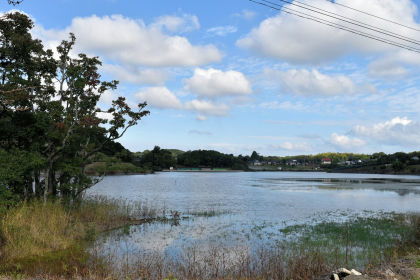 県道44号線に戻り、小倉池西岸を目指して走っていくと、左側には広い湖面が現れてきた。 やがて、目的の角地に着いたが大きな石碑は「圃場整備事業記念」だった。「ん?」、目的の自然災害伝承碑ではないが、小倉池を広く望める一等地に建っており、堂々たる石碑となっている。