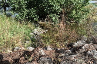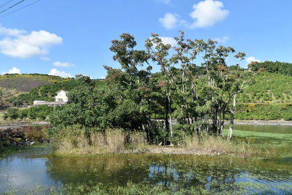 |  廃寺跡は湖岸に接した小島状になっており、背の高い広葉樹林に覆われている。湖面は平常時の水位と思われるが、水面に接するあたりに石積みらしいのが見える。また、水面以下にも浅い部分の広がりも少し見られる。資料のように“5間x4間の建物”を、想像するのもロマンがある。  左側に回り込んでみると陸地との接続部があり、荒れているが通路が石畳状に延びていた。