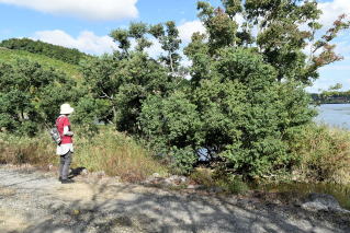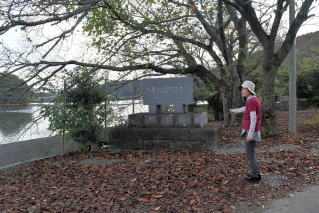 |  改修記念碑の奥には植樹記念碑(昭和50年記念植樹)があり、湖面の見える河岸には「池守明神」と刻まれた祠が祀られていました。