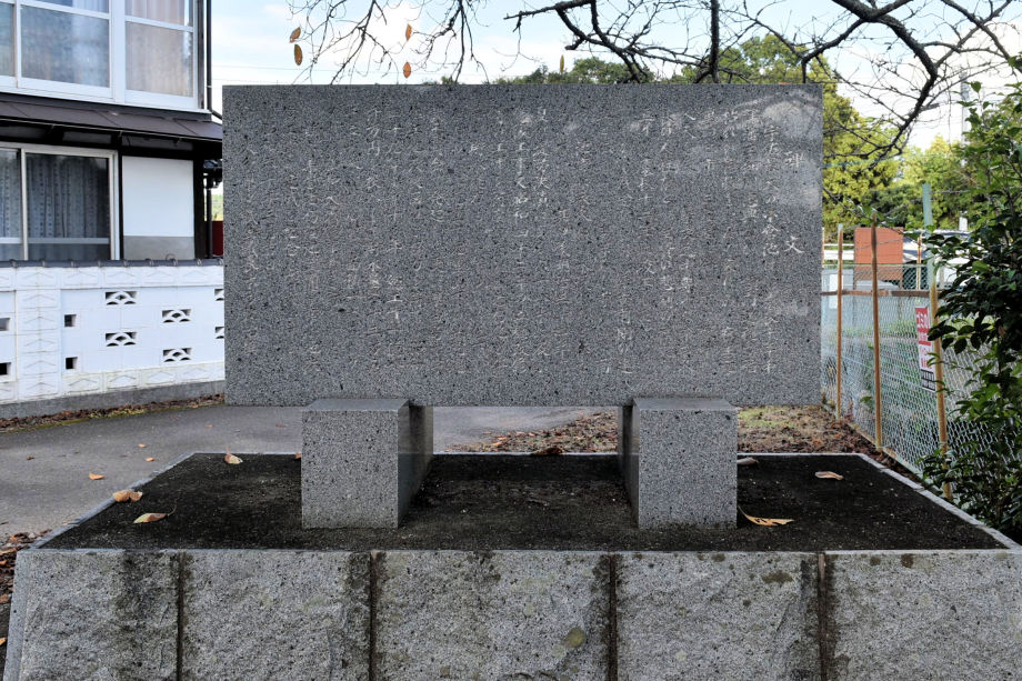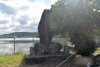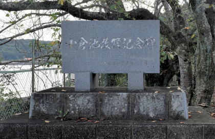 |  裏面の碑文(概要)は“宇佐市最大の小倉池は、慶長10年中津藩主細川忠興公が、領内の三庄屋に命じて、数千の人夫や尊い人柱など、悲劇の歴史を亘り慶長12年に竣工した。しかし、平安前期の建立と伝えられている、まぼろし寺が、東南方の池底に永久に水没した。”などと、小倉池造成時の様子が刻まれており、まぼろし寺の水没についても記されていた。