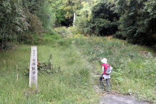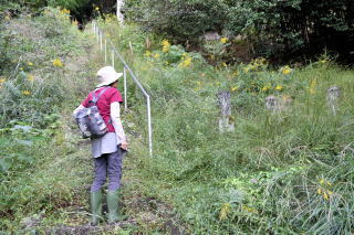 |  「わっ、草ヤブだ!」 気にはしていたが、石段の長い参道は夏草に覆われている。「長靴で、ゆっくり登っていこう」 それほどの急坂ではないが、草に隠れた足元は、ヘビも気になる上り坂。