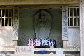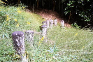 中ほどまで登っていくと斜度が増しはじめ、手すりのある参道に変わる。「ん?」右側には無縫塔が7.8個並んでおり樹林帯に消えている。無縫塔の先に寺院でもあったのだろうか。