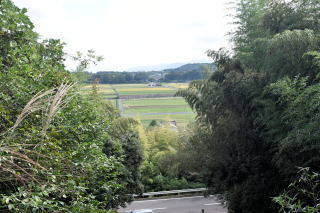 |  手すりに縋りながら、「それ、もう少し!」 振り向くと、かなり高い位置に登っている実感が得られ、足元の里景色には稲刈りの終わった田圃が広がっていた。 「よいしょ」で登り詰めると「お、スゴ~い」神秘的な空間に飛び出し、お堂と横穴墓群の眼前に到着した。