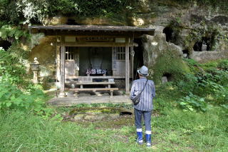|  お参りしておこうと前に動き始めたその時、「え! スズメバチ?」 羽音を立てながら、あたりを飛び始めた。 お賽銭を上げるまでもなく、ここは静かにバック、バック。 少し離れた位置になるが、ハチを刺激しないようにして周囲の横穴群を観察(撮影)する。